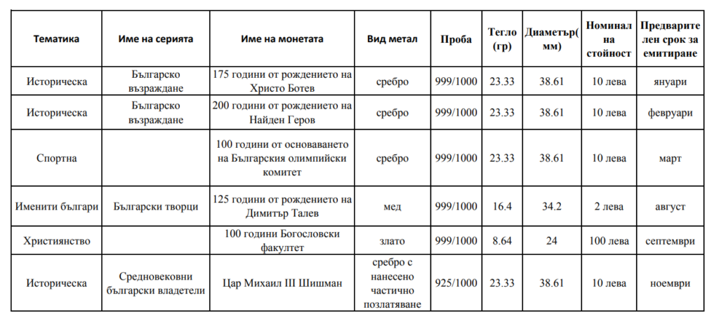 Програма за отсичане на възпоменателни монети през 2023 г Сподели в социалните мрежи Предишна Публикация Програма за отсичане на възпоменателни монети през 2022 г Следваща Публикация Наградена банкнота от 100 лева за сигурност Още интересни теми БНБ пуска в обращение медна възпоменателнамонета „100 години от рождението на Георги Парцалев“юни 6, 2025 БНБ пуска в обращение сребърна възпоменателнамонета „175 години от рождението на Захари Стоянов“април 26, 2025 НОВИ ЦЕНИ на Златните монети в БНБ !февруари 6, 2025