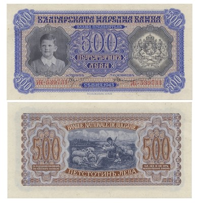 През юни 1944 г. пристигат банкнотите от 500 лева. Техният основен цвят е синият, другите цветове са кафяв и черен в различни тонове. Останалите видове от емисиятa а именно прословутите и редки банкноти от 1000 и 5000 лева „закъсват“, времето не стига за тях.