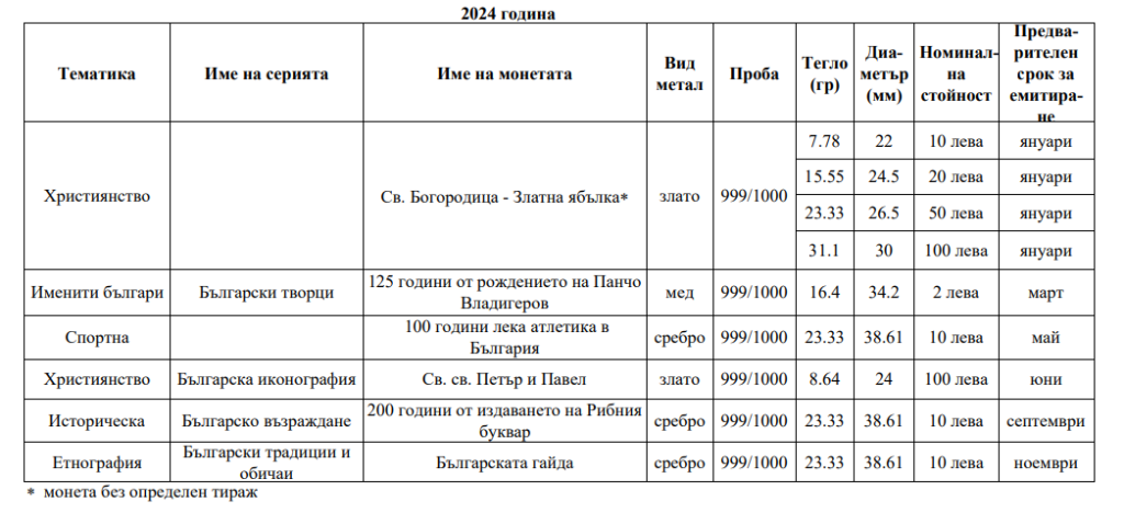 Програма за отсичане на възпоменателни монети през 2024 г. Сподели в социалните мрежи Предишна Публикация БНБ пуска в обращение златна възпоменателнамонета „100 години Богословски факултет“ Следваща Публикация Интересни серийни номера при банкнотите и техните наименования Още интересни теми БНБ пуска в обращение медна възпоменателнамонета „100 години от рождението на Георги Парцалев“юни 6, 2025 БНБ пуска в обращение сребърна възпоменателнамонета „175 години от рождението на Захари Стоянов“април 26, 2025 НОВИ ЦЕНИ на Златните монети в БНБ !февруари 6, 2025